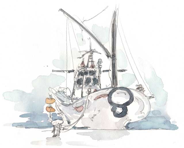 うだる真夏の暑さに、岸壁の漁船もぐったりしたように繋がれていた。