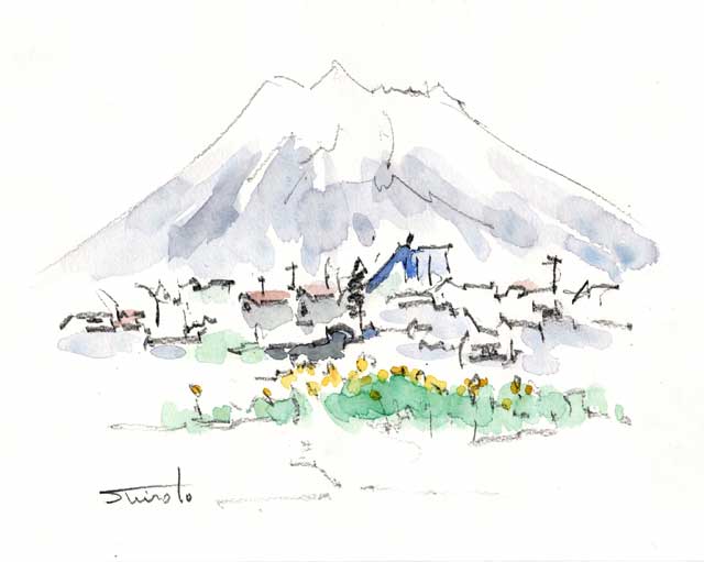 手前には菜の花を配しその後ろには簡素な住宅街。 さらにその奥には名峰「岩木山」。 この地を離れた者には、ことさら懐かしさを受ける「津軽富士」。